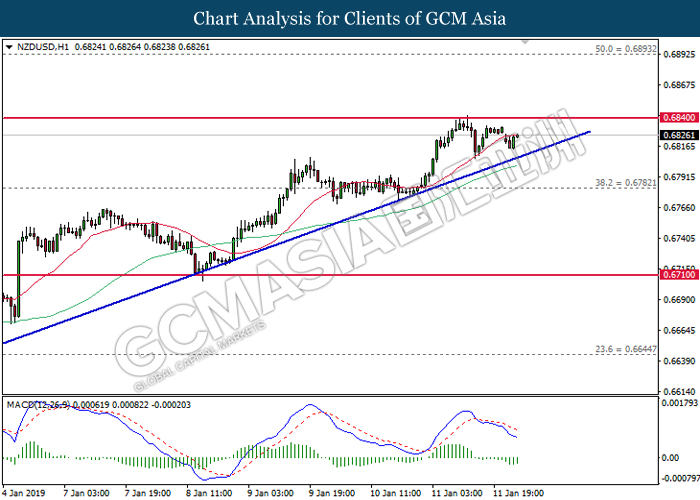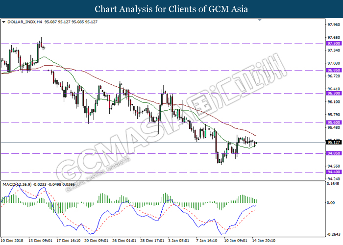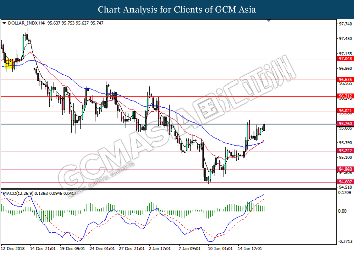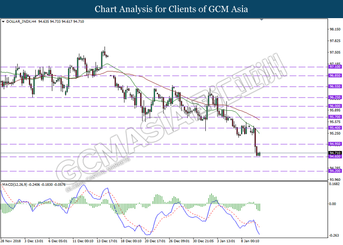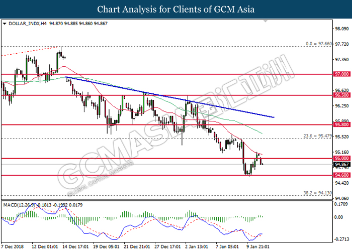 Dollar index which gauge against a basket of six major currencies tumbled to the lowest level in three months during early Asian trading session. Greenback received bearish momentum from the growing expectations that the Federal Reserve will put it hiking interest rate policy on pause this year. According to the Fed’s Minutes, there are few of the policymakers proposed to keep the interest rate steady during the meeting on 18 – 19 December. Moreover, market sentiment bolstered after U.S. President Donald Trump reiterated that the Sino trade talk was gone well, the optimism in trade dispute may reduced the demand of safe heaven asset. As of writing, Dollar index inched down 0.08% to 94.70.