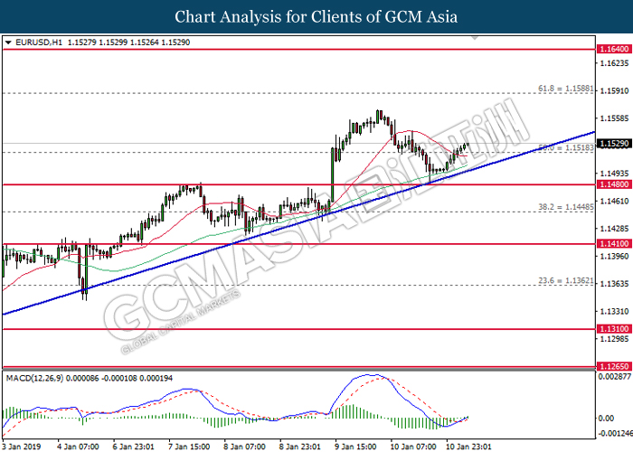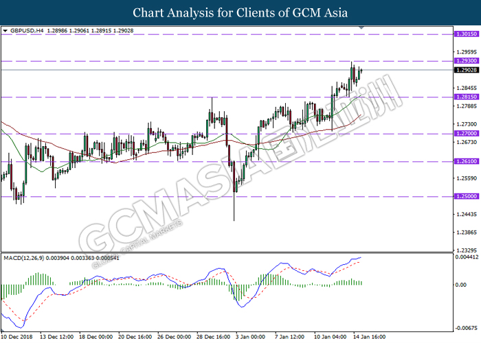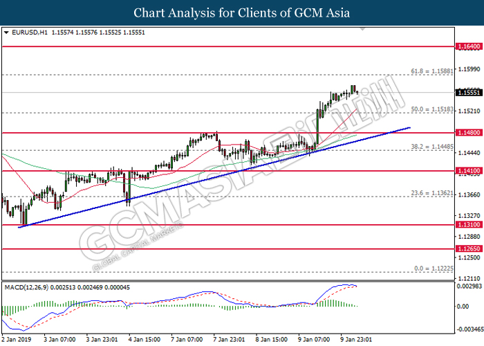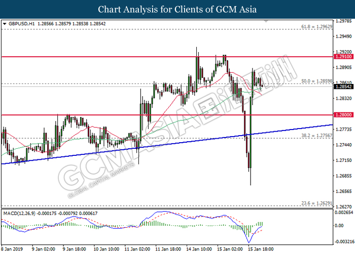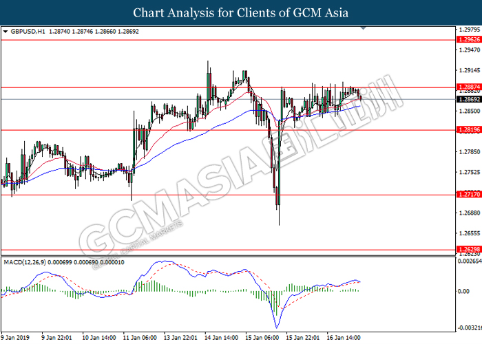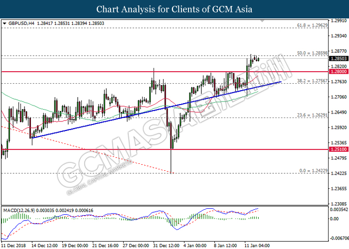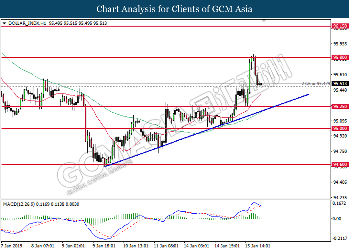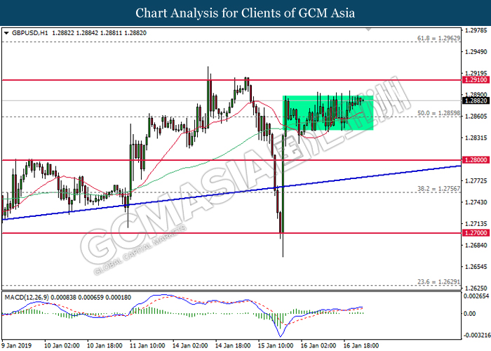 Dollar index traded flat against its six major peer currencies after hitting high level of 95.75 while investor currently wait for the crucial data that will be announced on later today, including U.S. Philadelphia Fed Manufacturing Index and New Home Sales. A higher than expected reading would be taken as a bullish momentum toward the Greenback and portraying that the economic growth outlook is still remain resilient. Prior to the release of data, investor will also keeping their eyes on the US government shutdown issues as it had continue to the 26th day while there is no any clear end in sight yet. Although US President Donald Trump has signed the bill that guarantee back pay for the government employees who have been furloughed during the partial government shutdown, but the record breaking of US government shutdown is begin to harm the US economy as it weighed significantly on growth and could potentially push the US economy into a contraction. Dollar index rose 0.05% to 95.70 as of writing. Besides, the pair of GBP/USD inched down 0.04% to 1.2875 after UK PM Theresa May survived from the no confidence vote that against her. As of now, Labour of MPs is exerting pressure on Jeremy Corbyn to back a second referendum where they resisted to campaign a vote on British withdrawal from European Zone again.