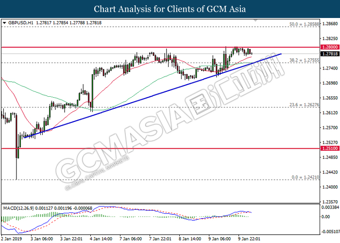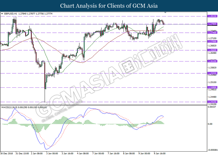 GBPUSD, H1: GBPUSD was traded lower following prior retracement from the resistance level near 1.2800. MACD which begins to form a death cross signal suggests the pair to be traded lower in short-term, towards 1.2755.
