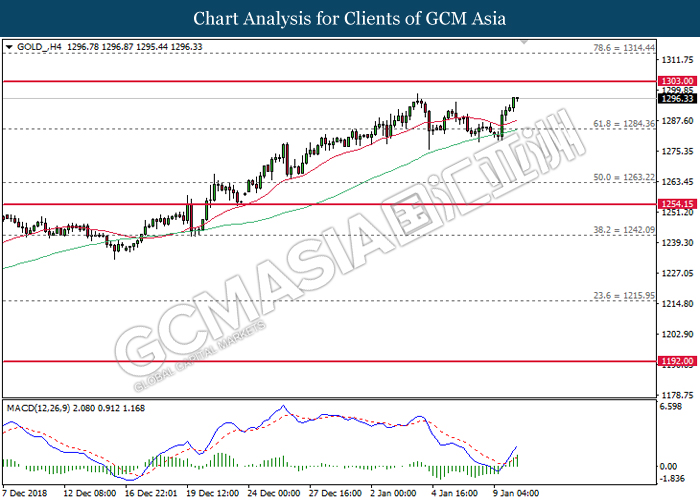 GOLD_, H4: Gold price was traded higher following prior rebound from prior low at 1284.35. MACD which has formed a golden cross signal suggests its prices to be traded higher in mid-term, after a successful closure at 1303.00.