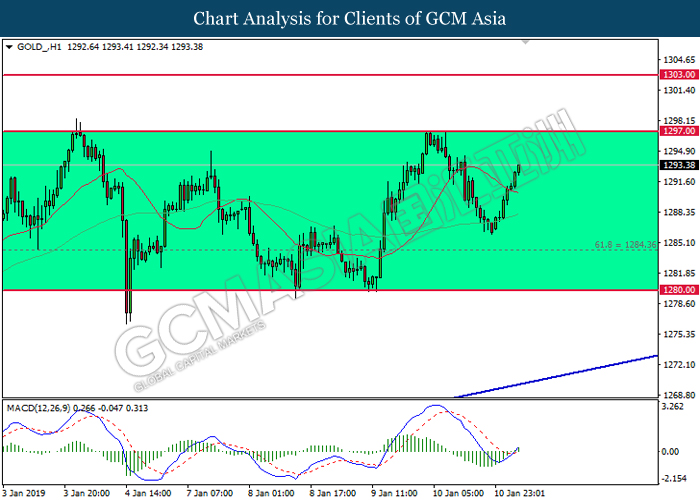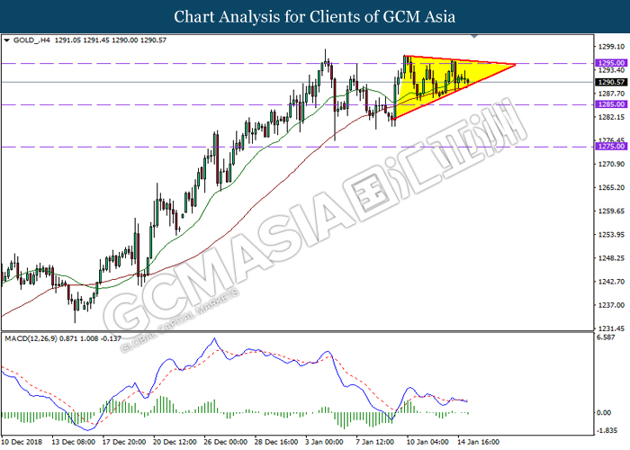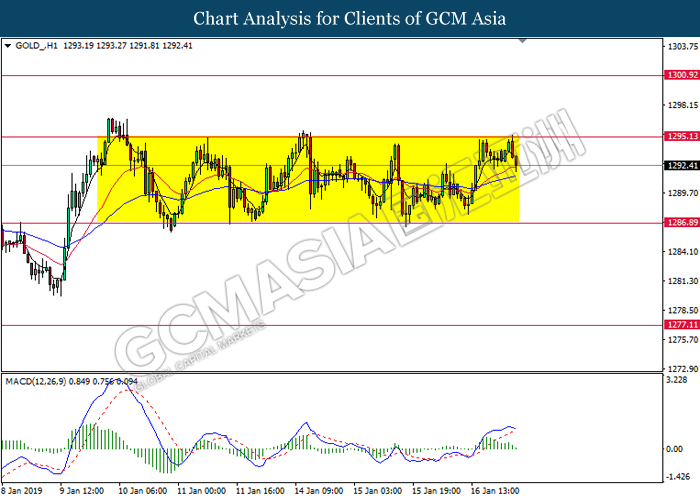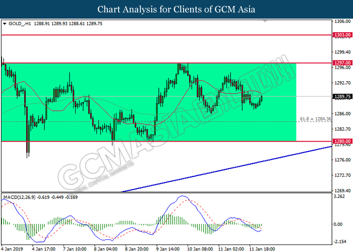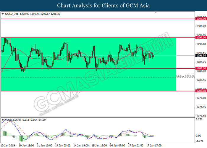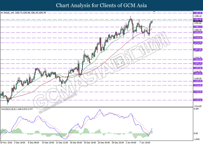 GOLD_H1: Gold was traded higher following prior breakout above the previous resistance level 1288.10. MACD which display diminishing bearish momentum suggest gold to extend its gains towards the resistance level 1295.00