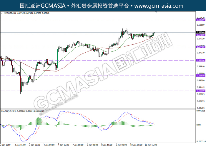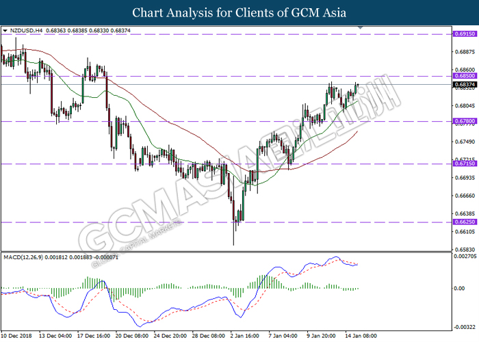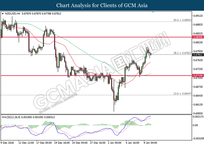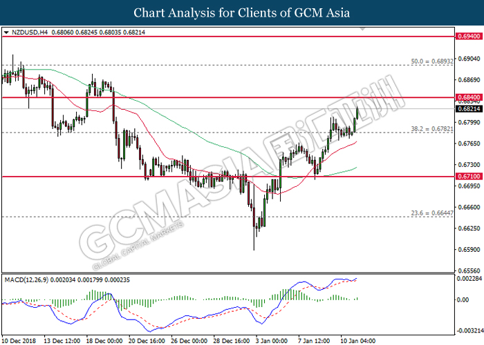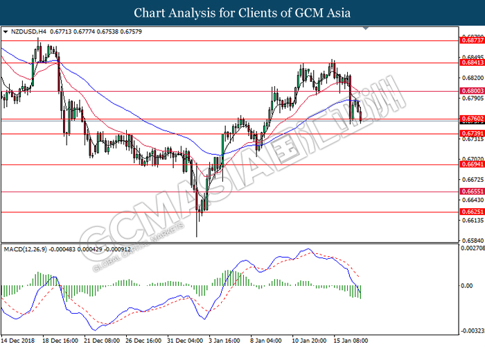 NZDUSD, H4: NZDUSD was traded higher while currently retest the resistance level 0.6760. MACD which illustrate bullish momentum suggest the pair to extend its momentum after it breaks above the resistance level.