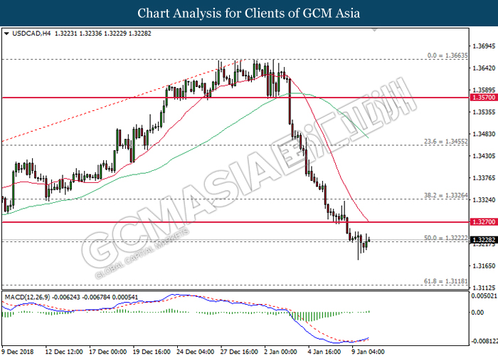 USDCAD, H4: USDCAD was traded higher following prior rebound from its low level. MACD which has formed a golden cross signal suggests the pair to be traded higher in short-term as technical correction.