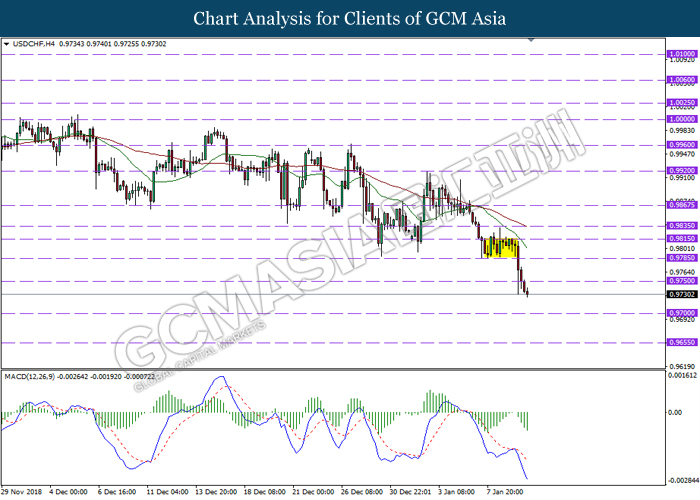 USDCHF, H4: USDCHF was traded lwoer following prior retracement from the resistance level 0.9950. MACD which illustrate bearish bias signal suggest the pair to extend it retracement towards the support level 0.9910.
