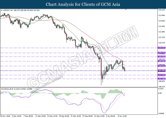 USDJPY, H4: USDJPY was traded lower following prior retracement from the downward trendline. MACD which has formed a death cross signal suggests the pair to be traded lower in short-term, in tandem with overall bearish trend.