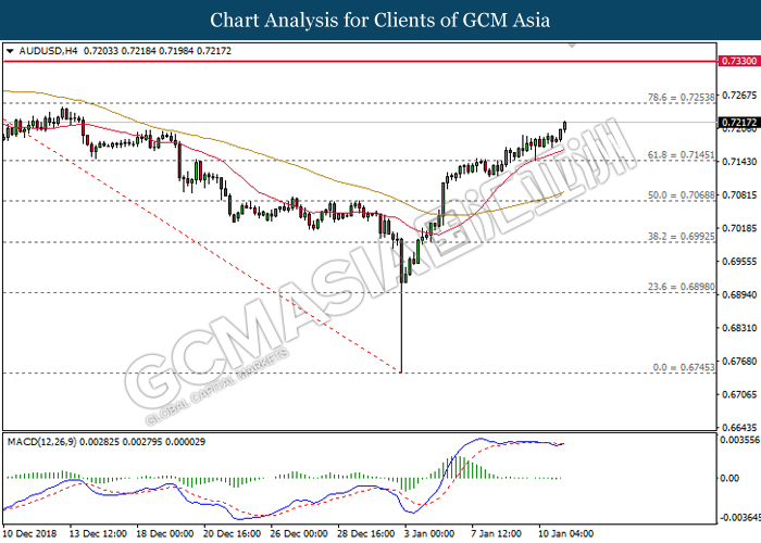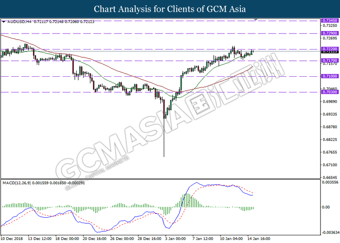 AUDUSD, H1: AUDUSD was traded higher following prior rebound from the support level at 0.7145. MACD which illustrate diminished downward momentum suggests the pair to extend its gains, towards the direction of 0.7255.