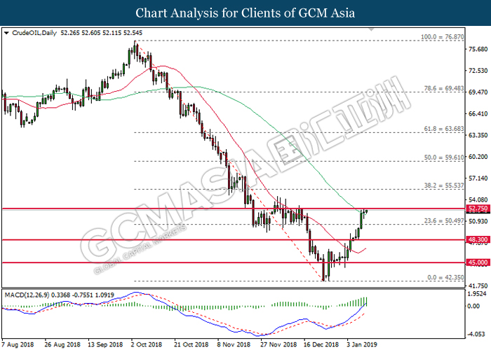 In the commodities market, crude oil price skyrocketed 0.81% to $52.60 per barrel as markets scatters to bid on oil market following US have plans to reconsider for harsher sanctions on Venezuela that could further decrease imports of country oil, boosting positive sentiment towards the oil markets. On the other hand, gold price struggled following increasing dollar strength and global tension ease.