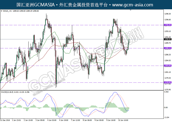 GOLD_, H4: Gold price remain traded in a sideway channel. Due to lack of clear signal from MACD, it is suggested to wait until further signal appears such as breakout above resistance level 1298.50 or support level 1286.90 before entering the market.