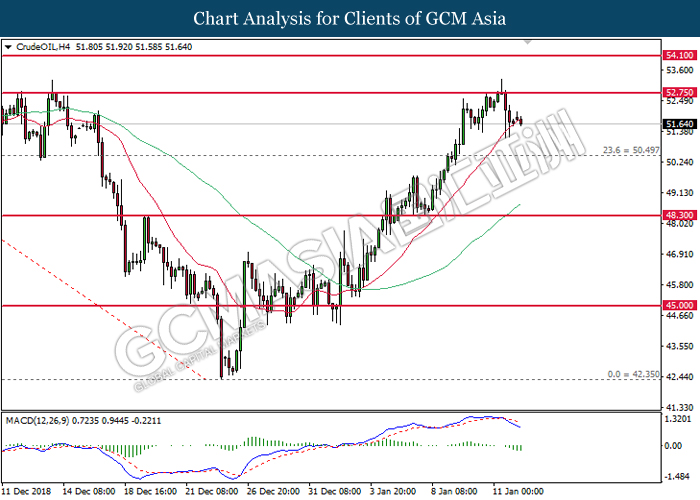 CrudeOIL, H4: Crude oil price was traded lower following prior retracement from the resistance level at 52.75. MACD which illustrate diminished upward momentum suggest its prices to be traded lower in short-term as technical correction.