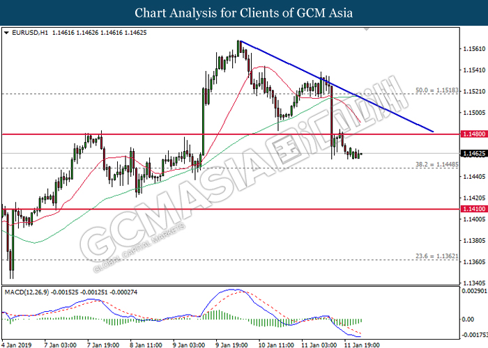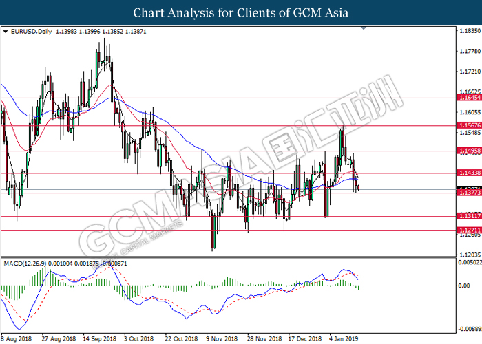 EURUSD, H1: EURUSD was traded lower following prior retracement from a high level. MACD which illustrate diminished upward momentum may suggest the pair to experience technical correction in short-term.