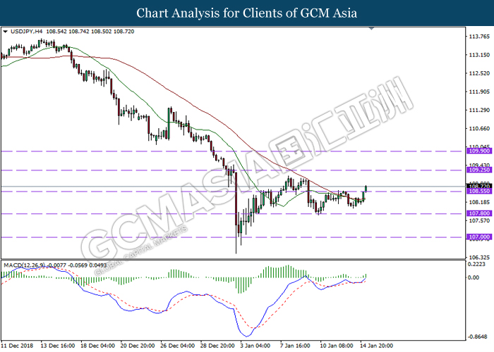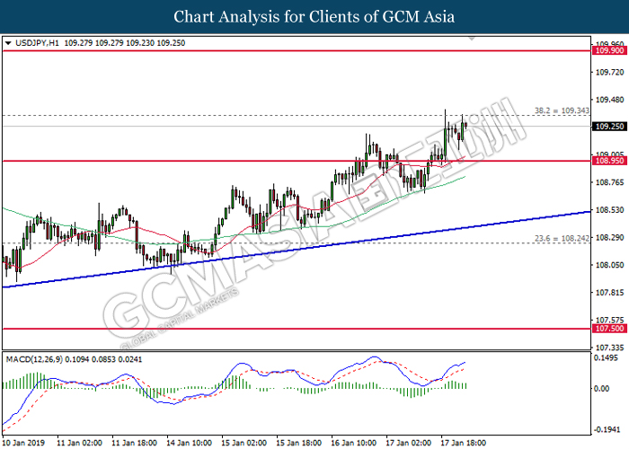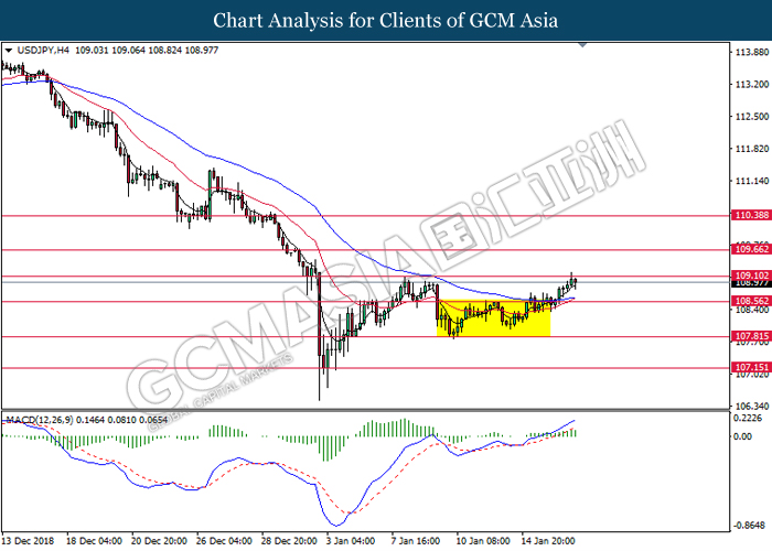 USDJPY, H1: USDJPY was traded higher following prior rebound from the support level of 108.95. MACD which illustrate bullish signal suggests the pair to advance further upwards after closing above 109.35.