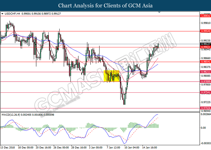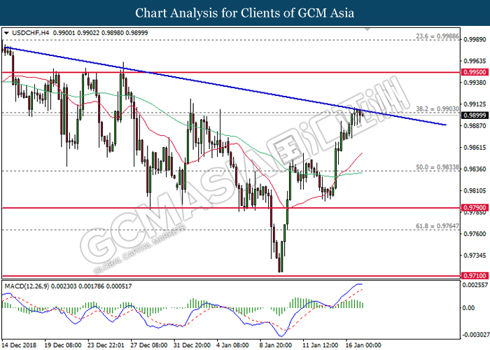 USDCHF, H4: USDCHF was traded lower following prior retracement from the resistance of 0.9950. MACD which illustrate diminished upward momentum suggests the pair to be traded lower in short-term as technical correction.