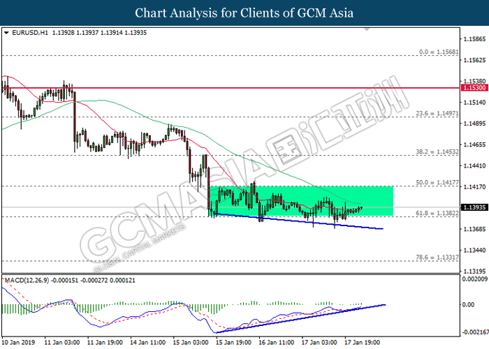 EURUSD, H1: EURUSD was traded flat while currently testing near the support of 1.1380. MACD which has formed a bullish divergence signal suggests the pair to extend its gains, towards the direction of 1.1420.