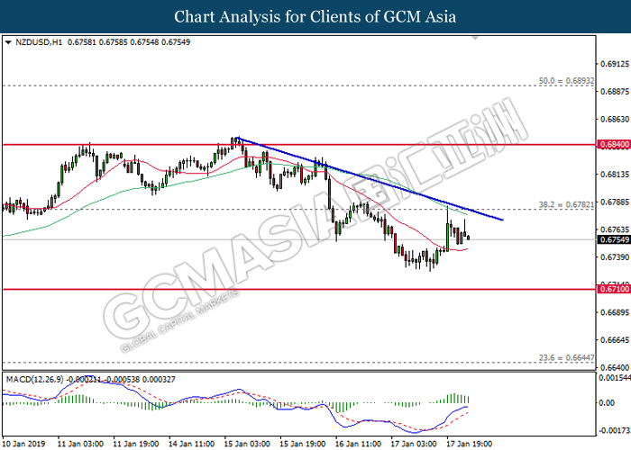 NZDUSD, H1: NZDUSD was traded lower following prior retrace from the downward trendline. MACD which illustrate diminished upward momentum suggests the pair to advance further downwards after closing below the 20-MA line (red).