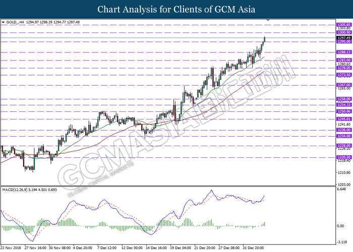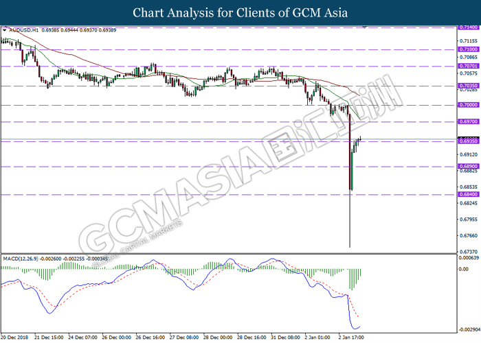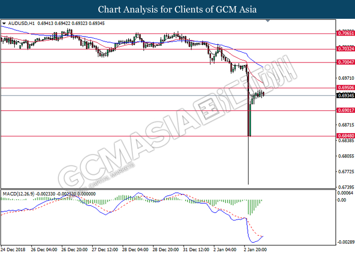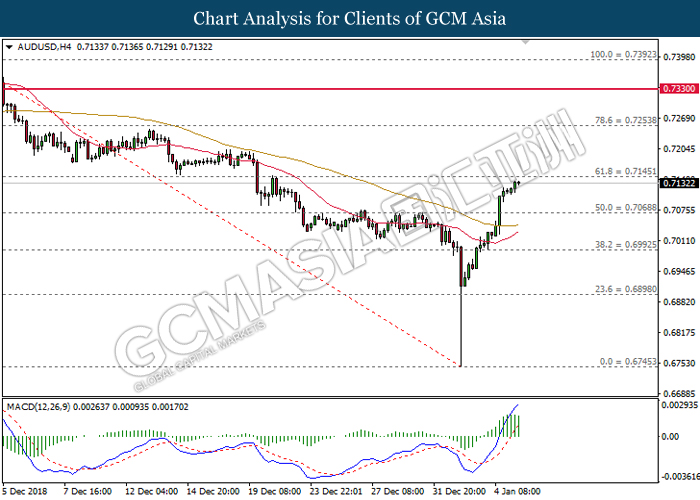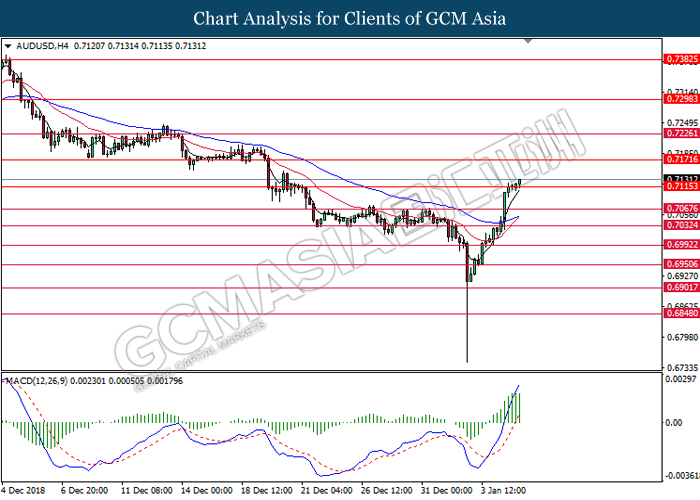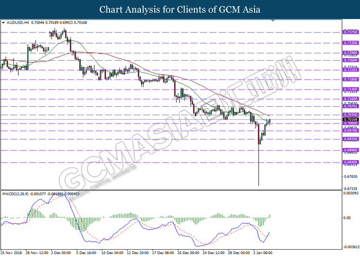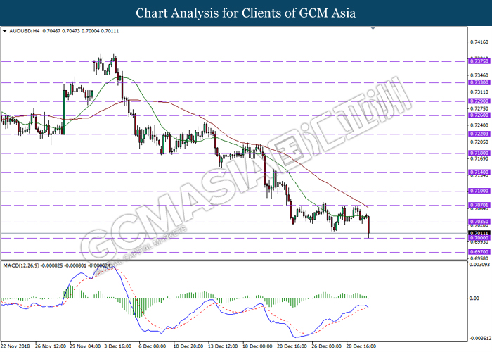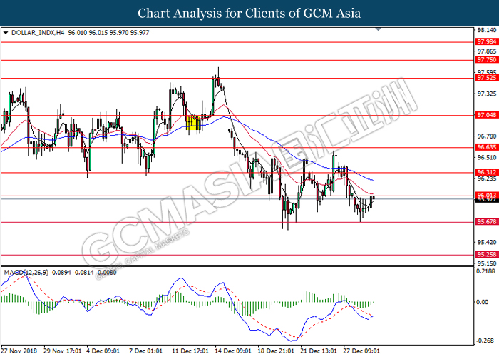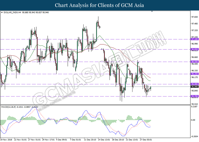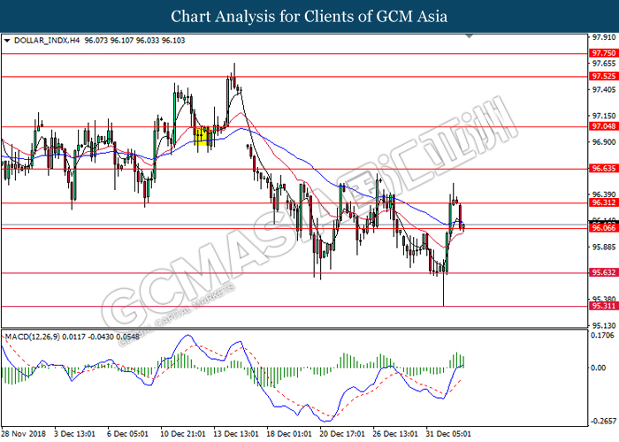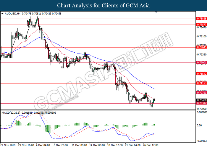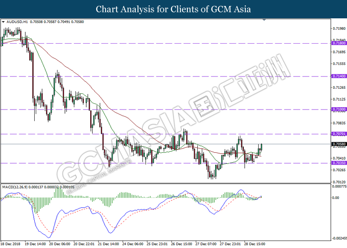 Dollar index surged against a basket of its major peer currencies during Asian trading session amid progress on Sino-U.S trade standoff generated bullish momentum toward the Dollar market. Sentiment of market participants toward the Greenback has been cheered up by U.S. President Donald Trump as he mentioned he held a ‘very good call’ with China Premier Xi Jinping on Saturday to discuss trade and emphasized that a “big step” was being made. According to China media, reporting that Xi Jinping hoped both countries can reach an agreement that mutually beneficial. Moreover, White house was exerting pressure on China for more details of how it might benefited US exports and loosen the regulations that suppress US firms, reported by Wall Street Journal. US government representative team would travel to Beijing in the week of Jan 7 to have face to face meeting with Chinese negotiating team since both country’s supreme leader agreed to a 90 days truce during G20 meeting in Argentina. As of now, Dollar index rose 0.07% to 96.00 while the pair of AUD/USD inched up 0.31% to 0.7060.