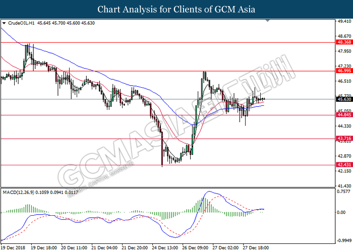 In the commodities market, crude oil price increased by 0.85% to $45.45 per barrel during early Asian trading session. Current outlook for crude oil market remained poor as inventory reports from the EIA and API both reported higher than expected inventory level. Besides that, US Baker Hughes Oil Rig Count also reported an increased in 2 oil rigs over the weekend. Investors are currently waiting for OPEC production cut to be taken into effect early next month. On the other hand, gold price fell by 0.16% to $1278.60 a troy ounce amid market uncertainties ahead of New Year holidays.