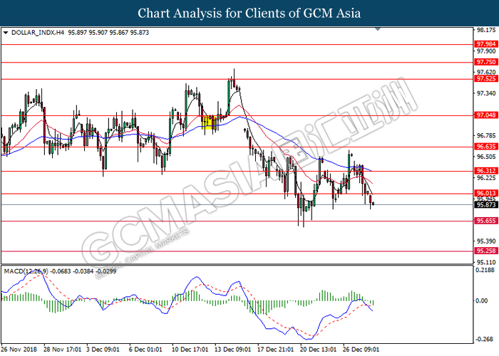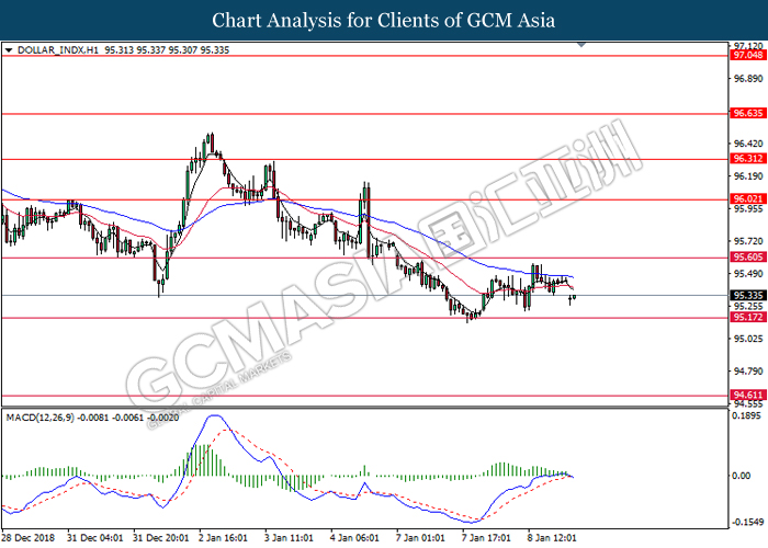 DOLLAR_INDX, H1: Dollar index was traded higher following prior gap down from the top level. However, MACD which illustrate diminishing bullish momentum and the formation of death cross suggest the index to undergo technical correction in short term toward the support level at 95.15.