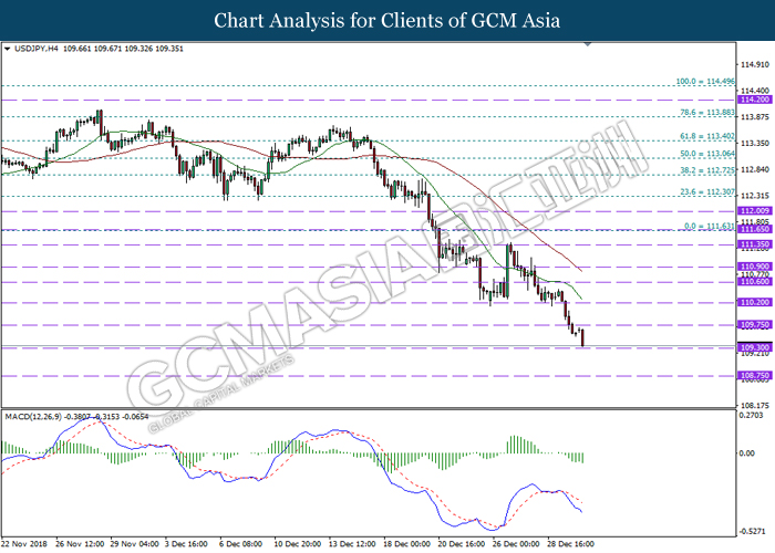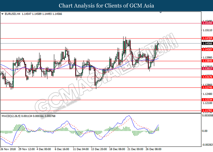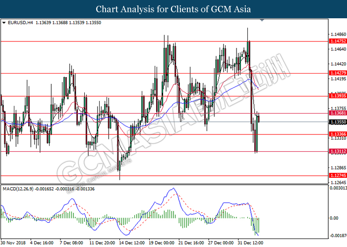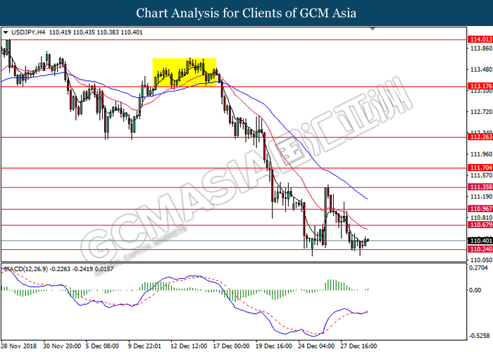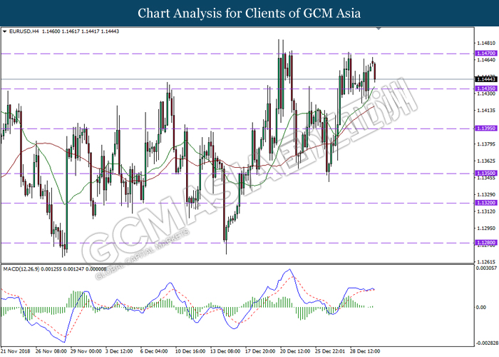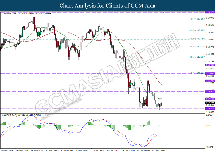 Dollar index weakened against a basket of six major currency pairs after the announcement of US Pending Home Sales data last Friday. The data which measures the purchasing activity of properties had an actual reading of -0.7%, missing economists’ expectations of 0.7% indicated a slowdown in demand for properties. The poor data boosted investors expectations of a slowdown in global economy as well as US economy itself, spiraling fears for investors that the US Federal Reserve (Fed) will pause future rate hikes. Current outlook for the dollar market remained cloudy ahead of New Year holidays while investors will keep their eye on this Friday’s Nonfarm Payrolls data to further determine the momentum for the dollar. As of writing, dollar index fell by 0.04% to 95.90. In other news, pair of EUR/USD was up by 0.04% to 1.1445 amid the approval of Italian budget deficit. The Italian parliament approved a revised budget deficit for 2019, from a 2.4% GDP to 2.04% just before the deadline expired, allowing the country to avoid sanctions from the European Commission.