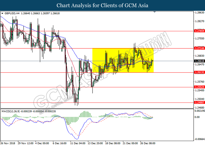 GBPUSD, H4: GBPUSD was traded lower in a sideway channel following prior retracement from the resistance level at 1.2715. MACD which display diminishing bullish signal suggest the pair to extend its losses toward the support level at 1.2615.