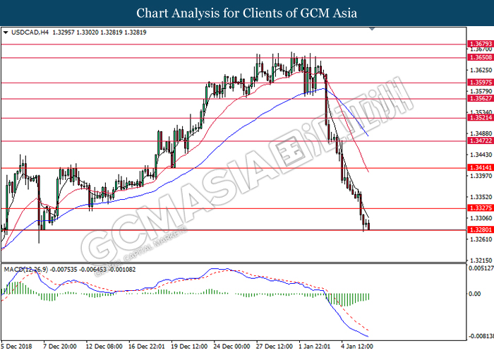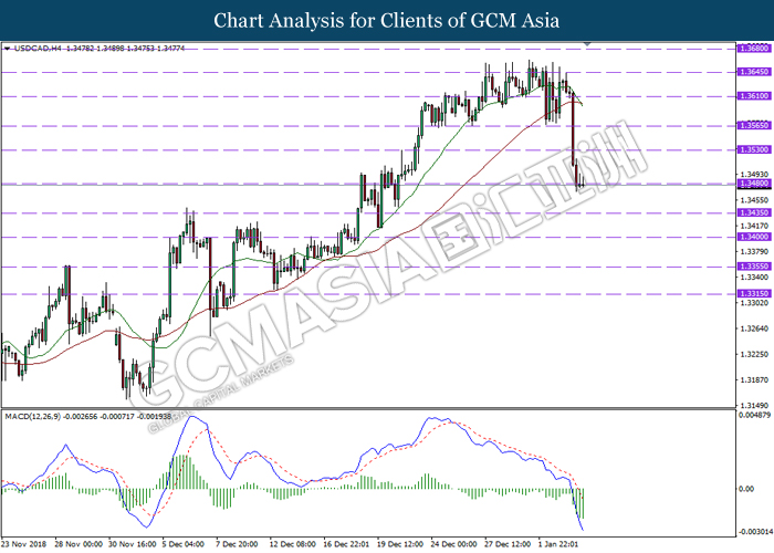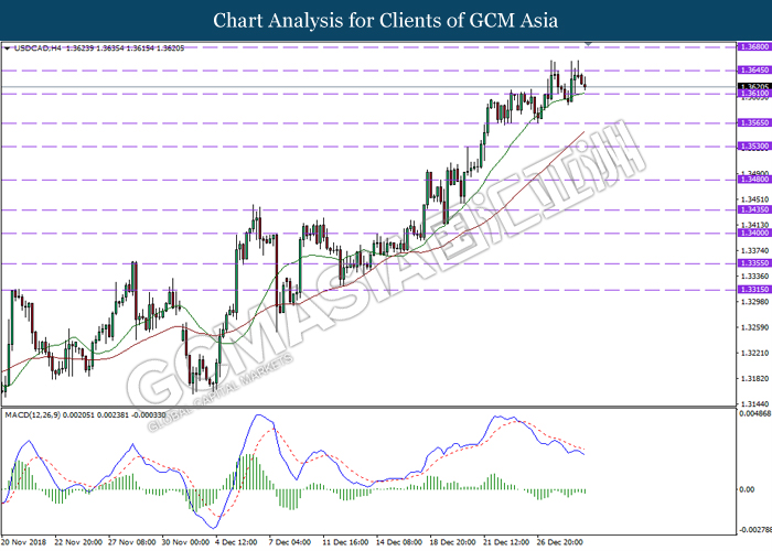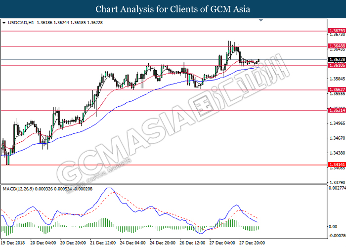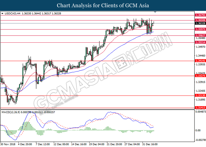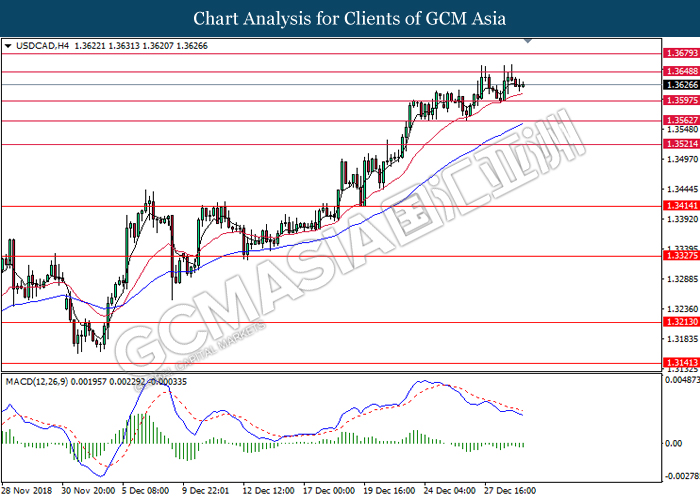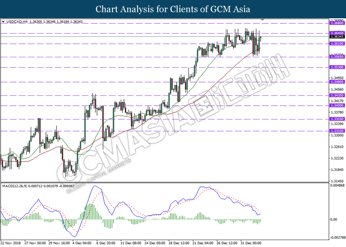 USDCAD, H4: USDCAD was traded lower while currently testing near the support level 1.3610. MACD which display bearish signal suggest the pair to extend its losses after a breakout below the support level.