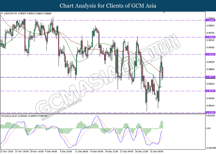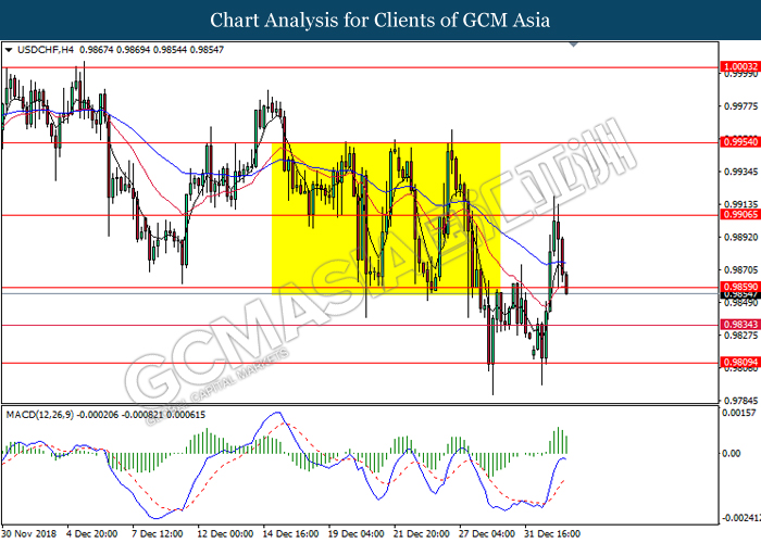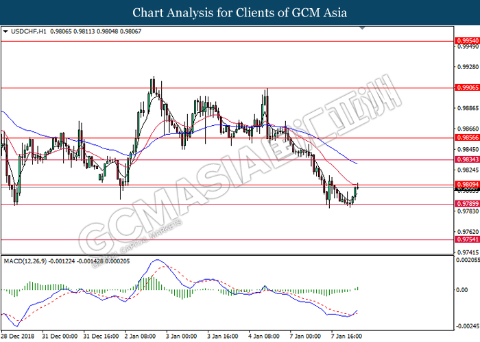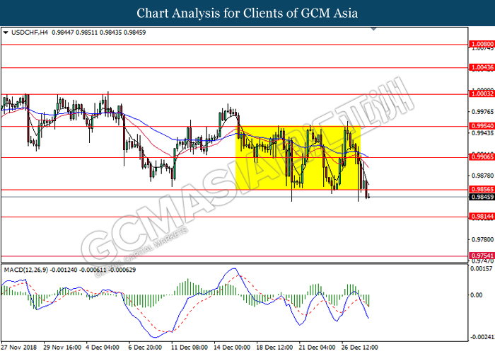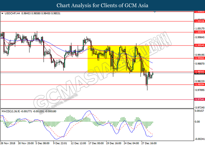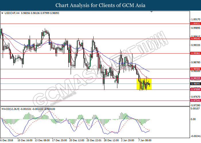 USDCHF, H4: USDCHF was traded higher while currently testing near the resistance level at 0.5855. MACD which display diminishing bearish momentum suggest the pair to extend its rebound after successfully breakout above the resistance level at 0.9855.