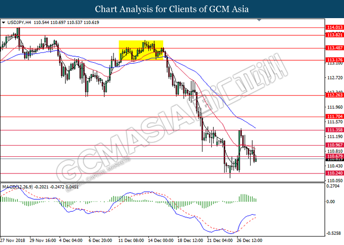 USDJPY, H4: USDJPY was traded lower following prior breakout below the previous support level at 110.70. MACD which display diminishing bullish momentum suggest the pair to extend its losses toward the support level at 110.25.