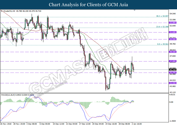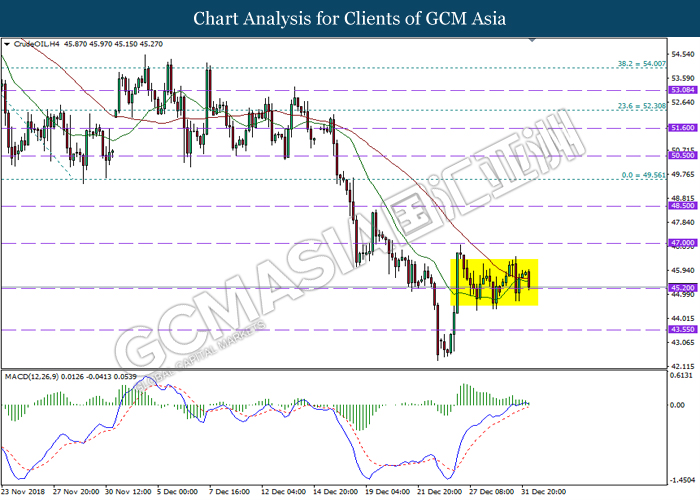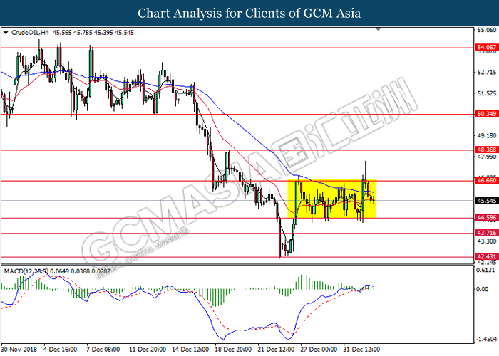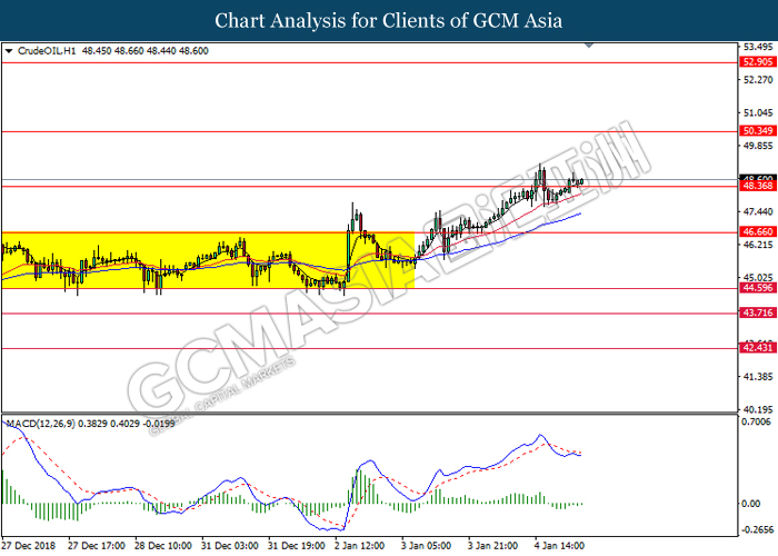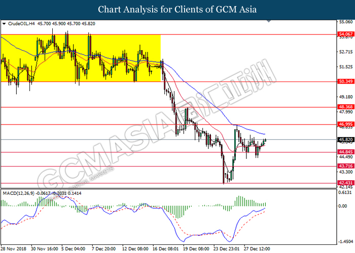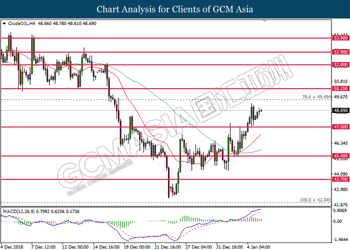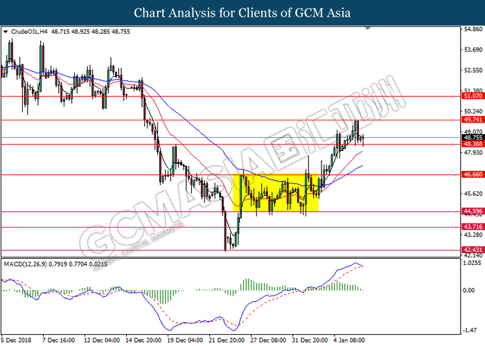 CrudeOIL, H4: Crude oil price experienced some setbacks following prior retrace from 49.50. MACD which begins to form a death cross signal suggests its prices to experience technical correction in short-term.