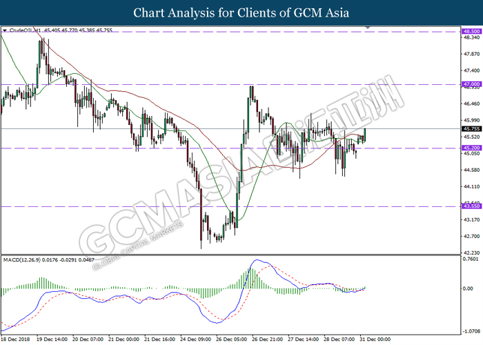 CrudeOIL, H1: Crude oil price was traded higher following prior breakout above the previous resistance level 45.20. MACD which display bullish signal and the formation of golden cross suggest the commodity to extend its gains towards the resistance level 47.00.