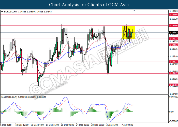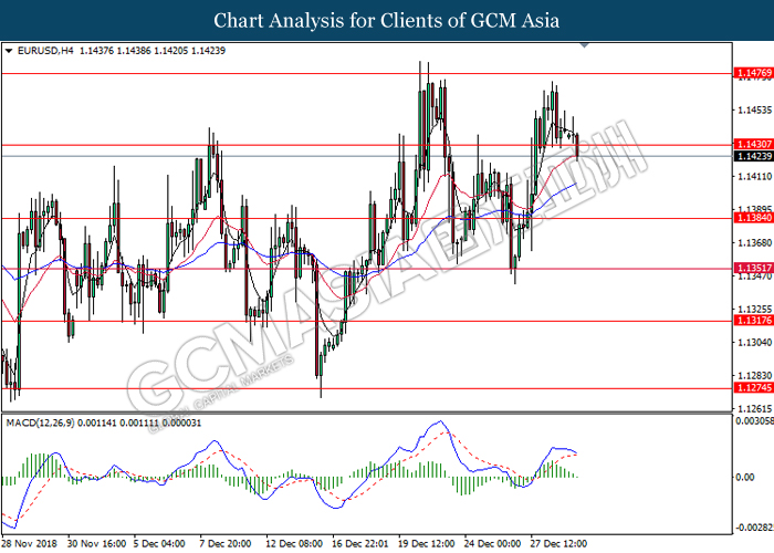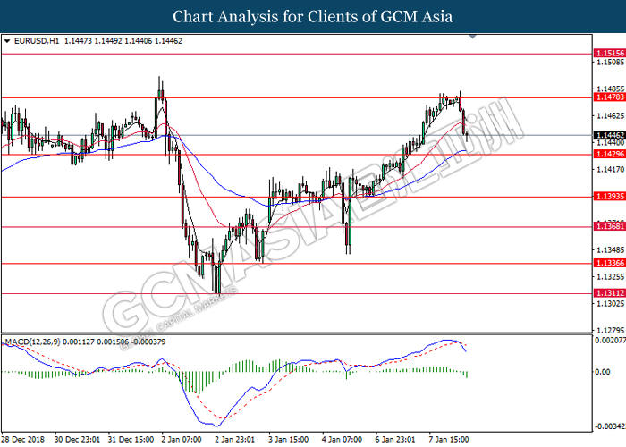 EURUSD, H4: EURUSD was traded lower while currently testing the support level 1.1430. MACD which illustrate diminishing bullish momentum suggest the pair to extend its losses after the candle closure below the support level at 1.1430.