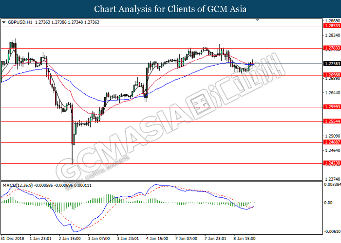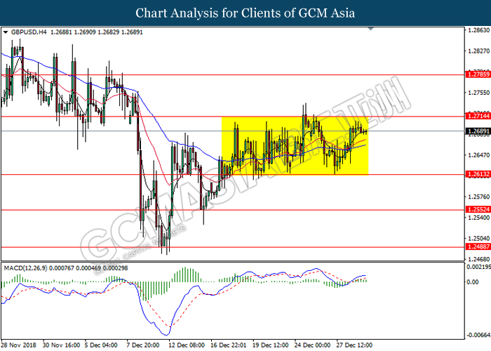 GBPUSD, H4: GBPUSD remained traded in a sideway channel while currently testing near the resistance level 1.2700. MACD which display diminishing bullish signal suggest the pair to undergo technical correction and retrace from its higher levels.