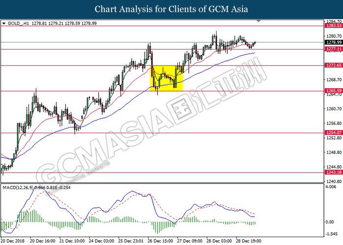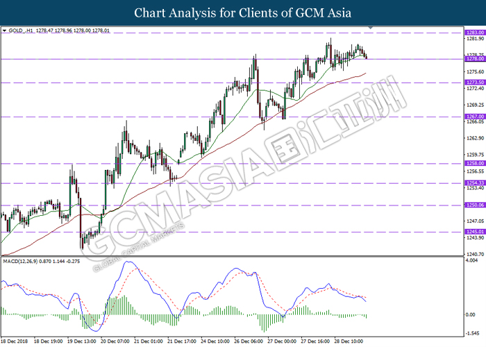 GOLD_, H1: Gold price was traded lower while currently testing the support level 1278.00. MACD which illustrate bearish momentum suggest gold to extend its losses after breaking below the support level.