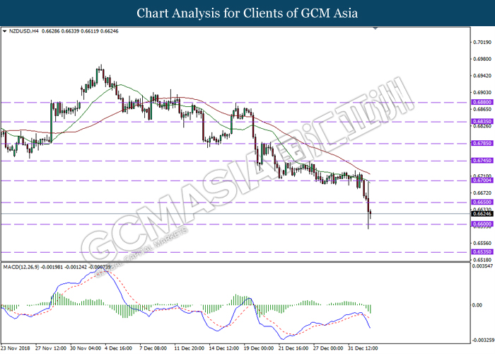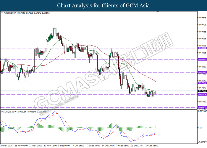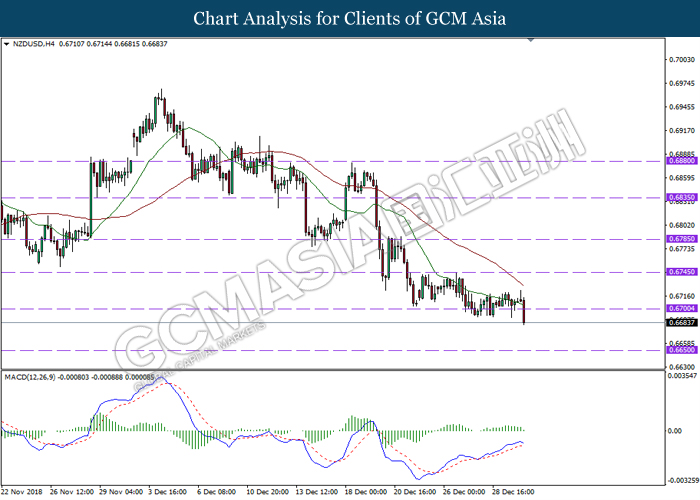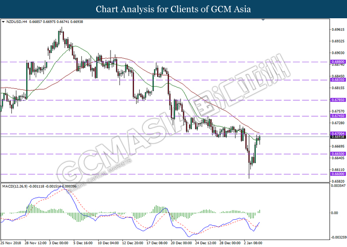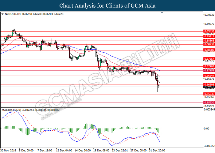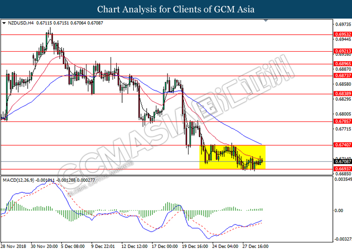 NZDUSD, H4: NZDUSD was traded lower following prior retrace from the downward trendline. MACD which illustrate diminishing upward momentum suggests the pair to experience technical correction in short-term.