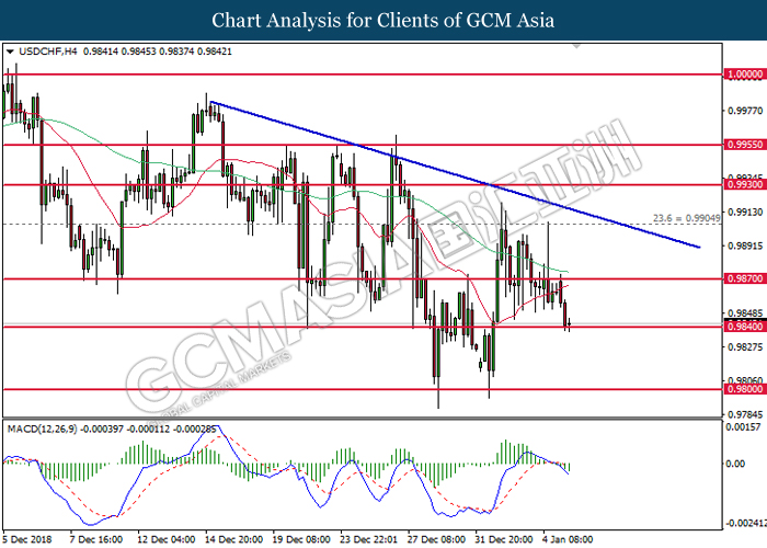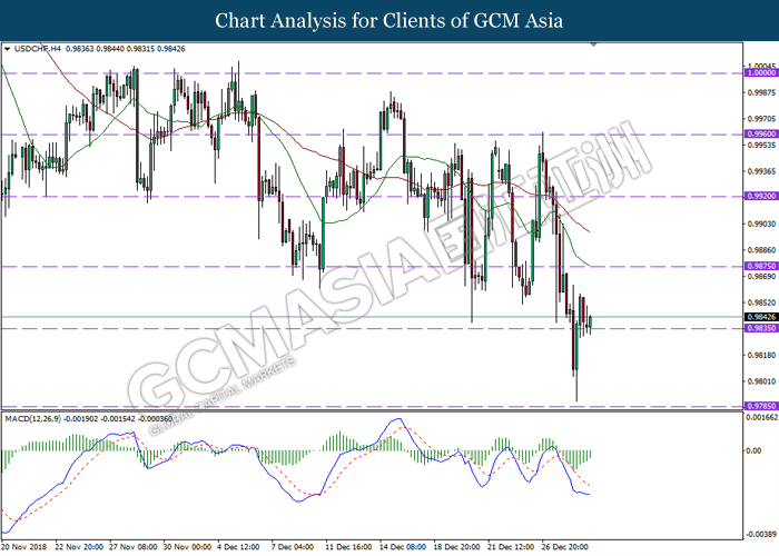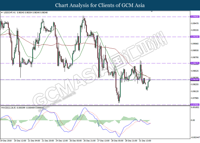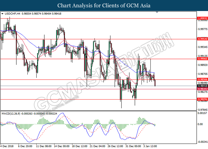USDCHF, H1: USDCHF was traded lower following prior retracement while currently testing near the 20-MA line (red). MACD which illustrate diminished upside bias suggests the pair to continue to bearish bias in tandem with current trend.