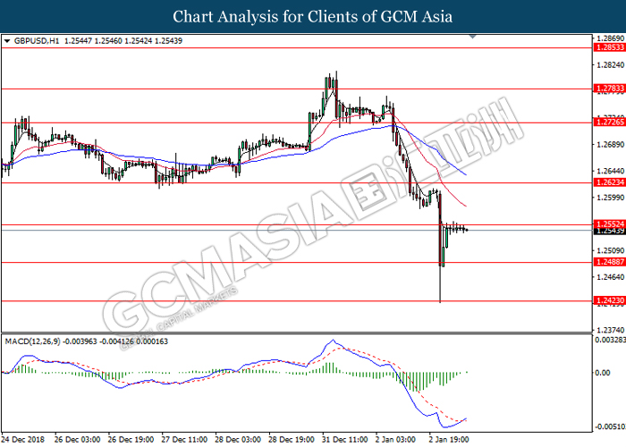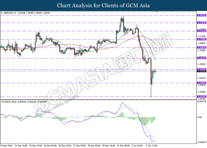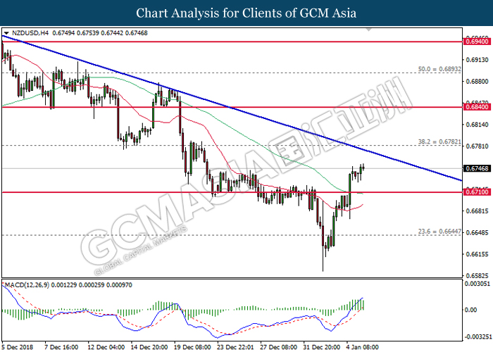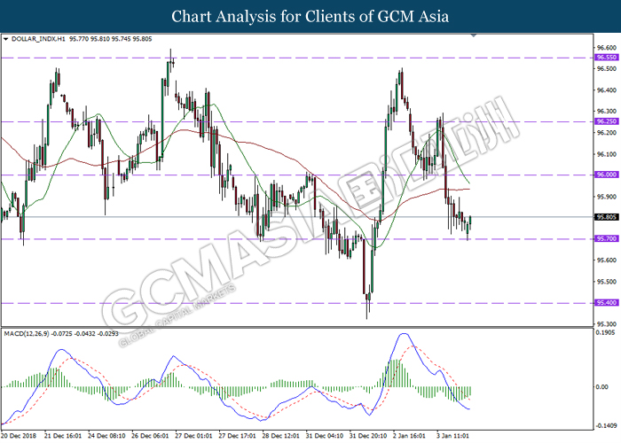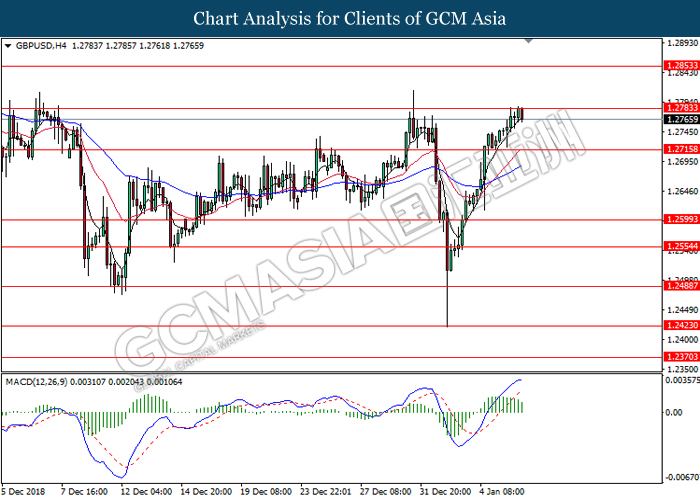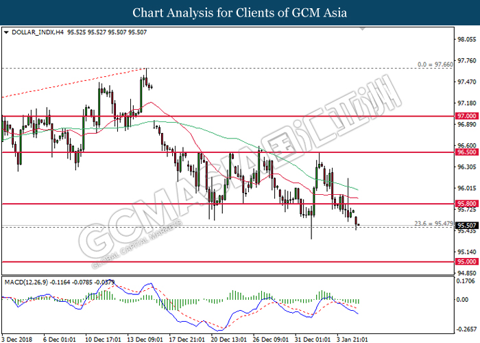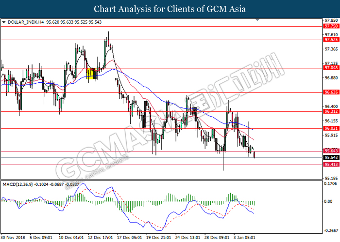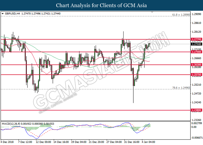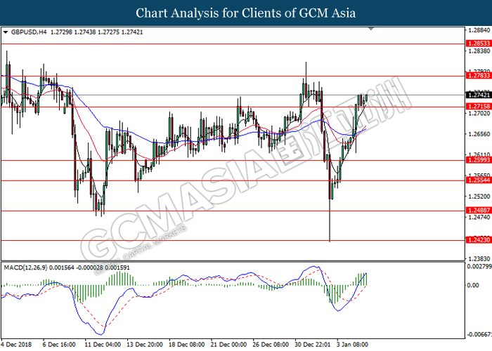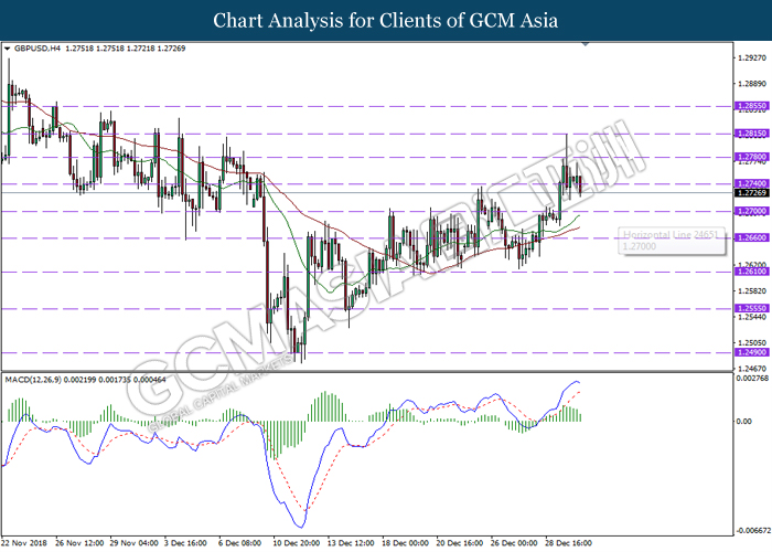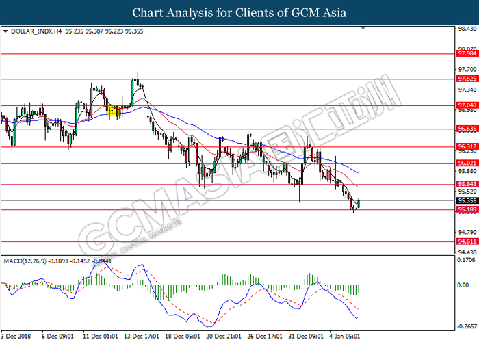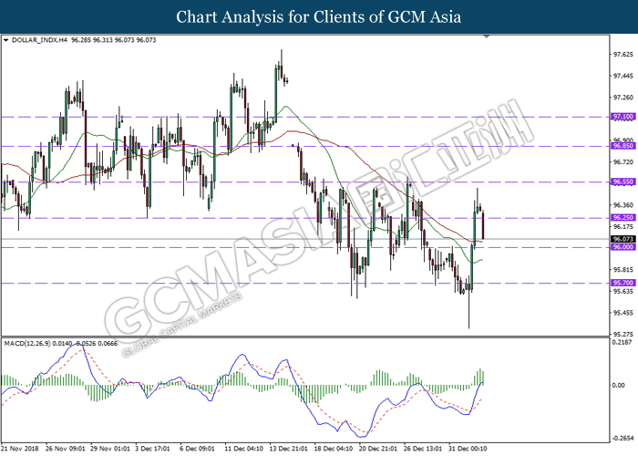 Dollar index rallied against a basket of six major currency pairs before early Asian trading session amid uncertainties in Brexit issue which caused investors to shift their investment to the dollar market. With global market sentiment worsening, the pressure weighing on pound sterling provided investors with confidence towards the dollar market although US JOLTs Job Openings data was lower than expected, indicating much less job opportunities. At the moment, all eyes will be placed on UK Parliamentary vote on Prime Minister Theresa May’s Brexit withdrawal on 15th January whereby a rejection towards the deal may caused a large sell-off for the pound sterling and increasing the chances for a hard Brexit. Besides that, investors are also waiting for the results of trade negotiations between US and China held two days ago where hopes of a trade deal may recover market sentiment. Dollar index was up by 0.10% to 95.45 while pair of GBP/USD was down by 0.08% to 1.2720 as of writing.