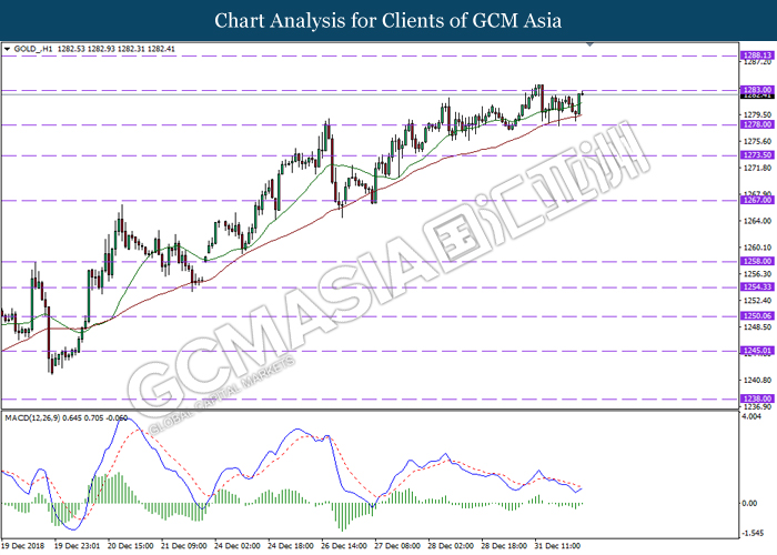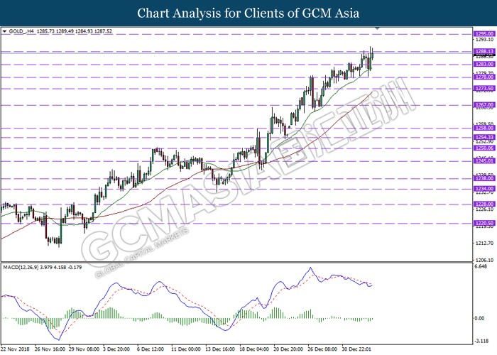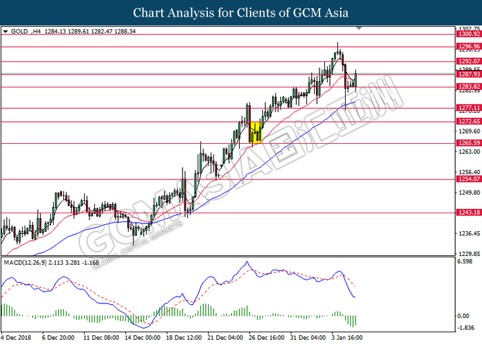 GOLD_H1: Gold was traded higher following prior breakout above the previous resistance level at 1282.65. However, MACD which illustrate diminishing bullish momentum suggest the commodity to undergo technical correction in short term toward the support level at 1282.65.