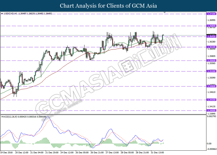 USDCAD, H1: USDCAD was traded higher following prior rebound from the support level at 1.3610. MACD which display diminishing bearish momentum suggest the pair to extend its gains toward the resistance level at 1.3650.