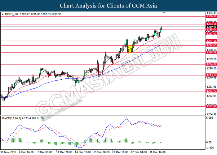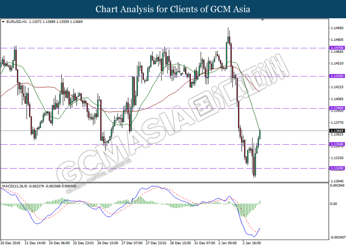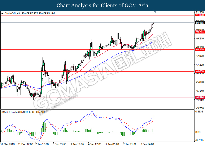 For the commodities market, crude oil price surged by 1.47% to $50.50 amid recovered hopes on easing of trade wars as US and China met up for trade negotiations two days ago. Investors are bidding on a positive outcome which will further increase the demand for crude oil. Further supporting the oil prices was OPEC’s production cut effective since 1st January to balance the price and inventory of crude oil. On the other hand, gold price edged higher by 0.06% to $1285.85 amid dollar fall.