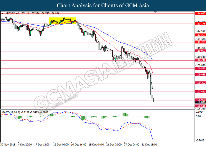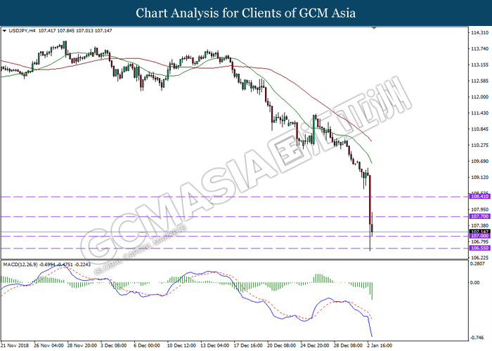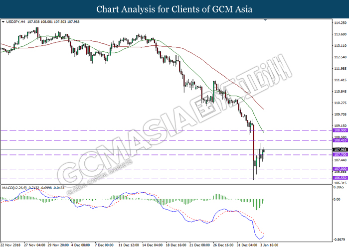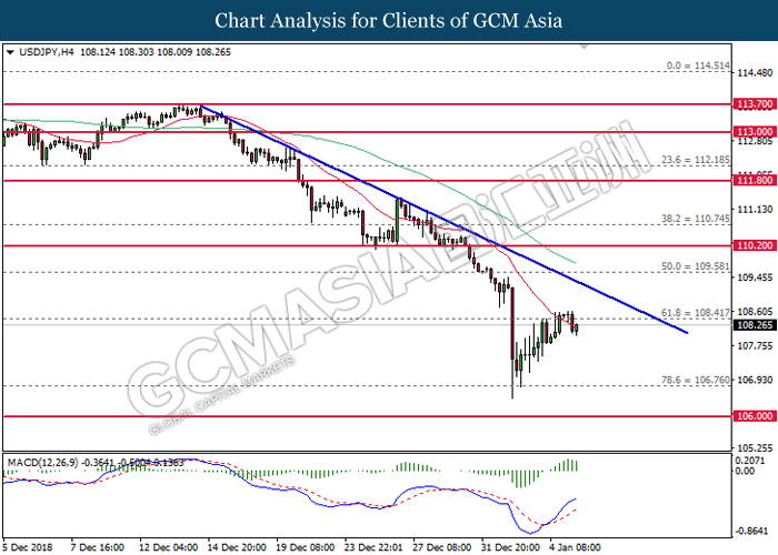 USDJPY, H4: USDJPY was traded higher following prior rebound from the lower levels. MACD which illustrate bullish signal suggests the pair to advance further upwards after a successful breakout from the downward trendline.