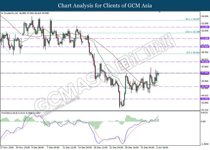 CrudeOIL, H4: Crude oil price was traded higher following prior rebound from the support level 45.80. MACD which display bullish signal suggest the commodity to extend its gains towards the resistance level at 47.00.