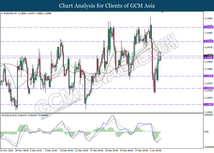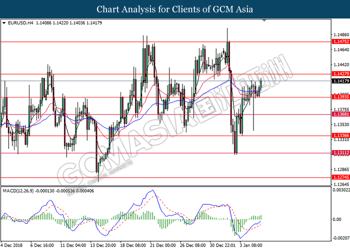For the commodities market, crude oil price surged by 0.60% to $48.80 while hitting higher levels. Recent sentiment towards the oil market turned positive supported by OPEC production cut taken into effect on 1st January last week. Furthermore, hopes on trade war easing between China and US also supported demand for oil as both countries meet up for trade negotiations this week. On the other hand, gold price fell by 0.26% to $1285.75 amid investors’ higher risk appetite.