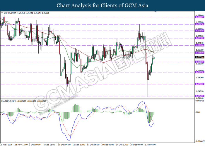 GBPUSD, H4: GBPUSD was traded upward in sideway channel following prior rebound from the support level at 1.2615. MACD which display bullish signal suggest the pair to extend its gains toward the resistance level at 1.2715.