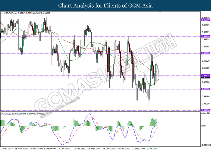 USDCHF, H4: USDCHF was traded higher following prior rebound from the support level 0.9835. MACD which display diminishing bearish momentum suggest the pair to extend its rebound towards the resistance level 0.9875.