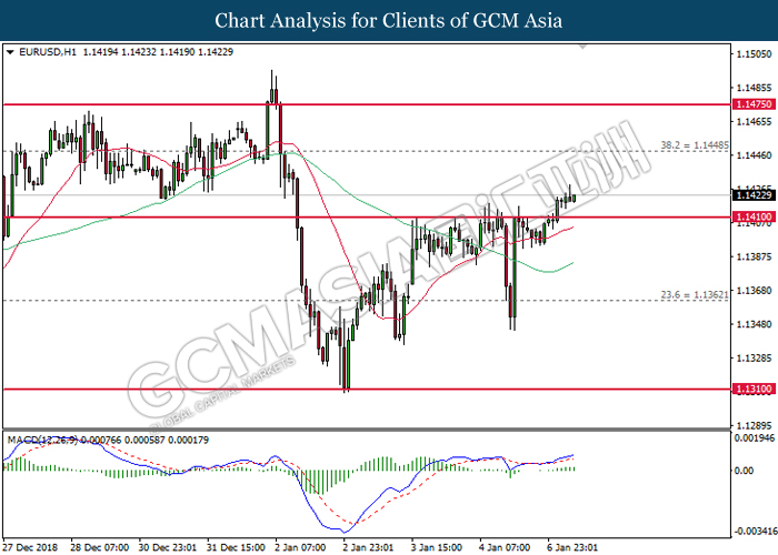 EURUSD, H4: EURUSD was traded higher following prior breakout above previous resistance level at 1.1430. MACD which illustrate bullish momentum and the formation of golden cross suggest the pair to extend its gains towards the resistance level 1.1475.