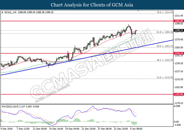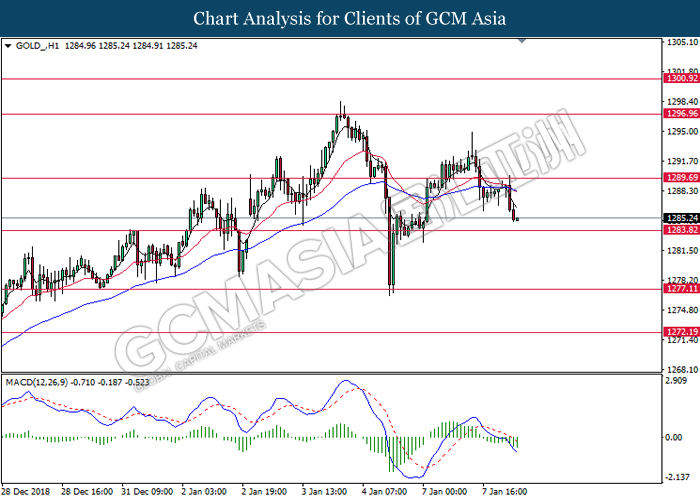 GOLD_, Daily: Gold price was traded lower while currently testing near the support of 1284.35. MACD which begins to form a death cross signal suggests its prices to advance further down after successfully closing below 1284.35.