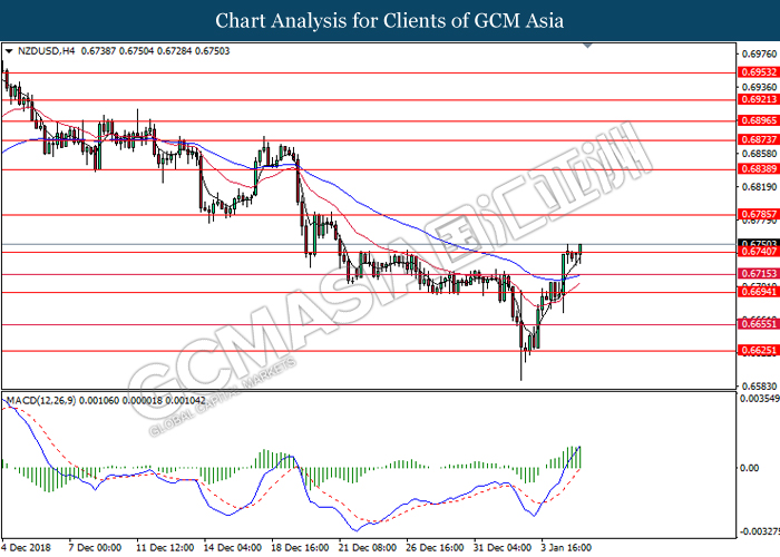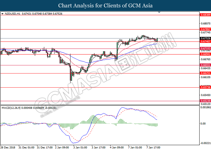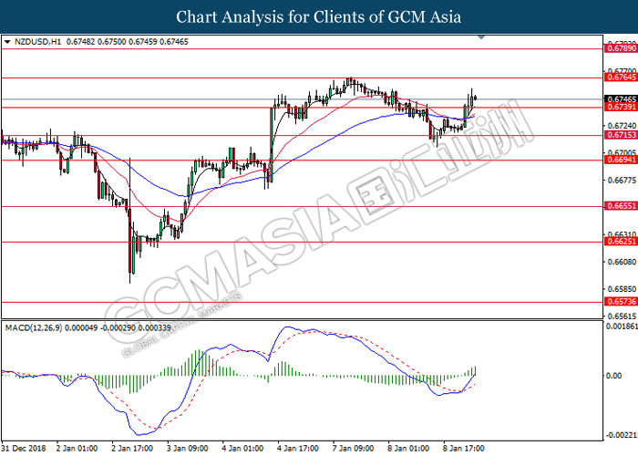 NZDUSD, H1: NZDUSD was traded higher following prior breakout above the previous the resistance level at 0.6740. MACD which illustrate bullish momentum and the formation of golden cross suggest the pair to extend its gains toward the resistance level at 0.6765.