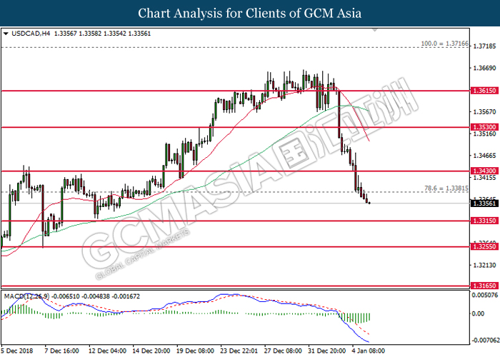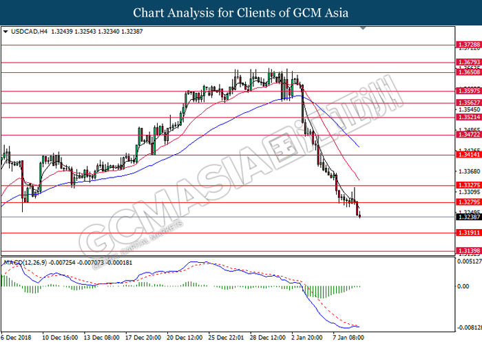 USDCAD, Daily: USDCAD extended its losses following prior closure below 1.3455. MACD which continues to illustrate bearish signal suggests the pair to extend its losses, towards the direction of 1.3220.