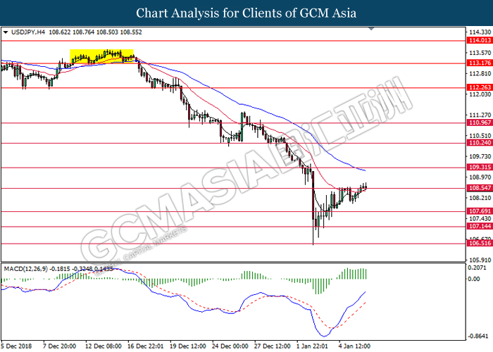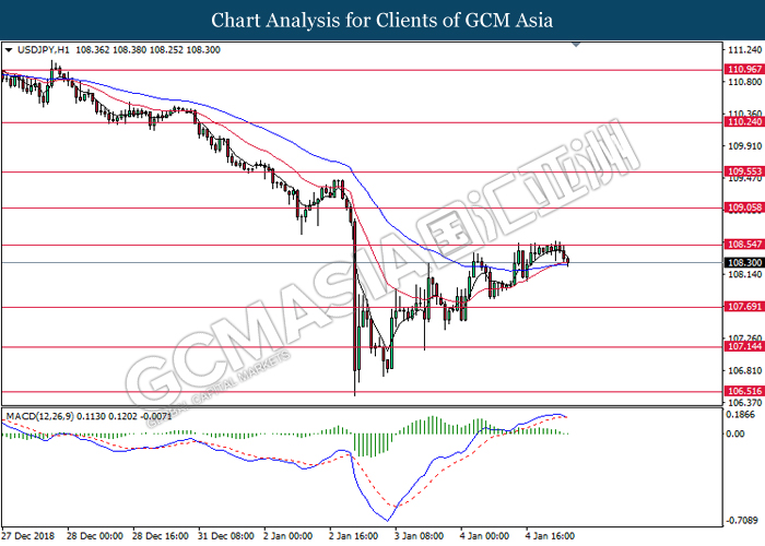 USDJPY, H1: USDJPY was traded higher following prior rebound from the support level at 108.55. MACD which illustrate diminishing of bearish momentum and the formation of golden cross suggest the pair to extend its gains toward the resistance level at 109.45.