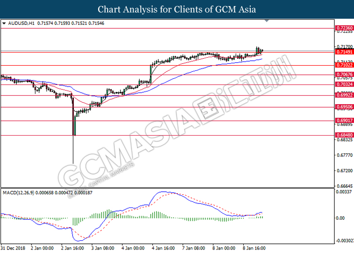 AUDUSD, H1: AUDUSD was traded higher following prior breakout above the previous resistance level at 0.7150. MACD which illustrate bullish momentum and the formation of golden cross suggest the pair to extend its gain toward the resistance level at 0.7235.