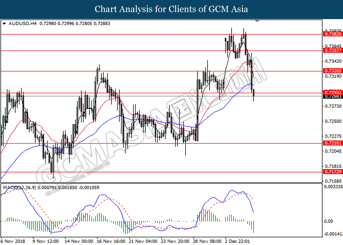 AUDUSD, H4: AUDUSD was traded lower while currently testing near the support level at 0.7295. MACD which illustrate bearish momentum suggest the pair to extend its losses after successfully closed below the support level at 0.7295.
