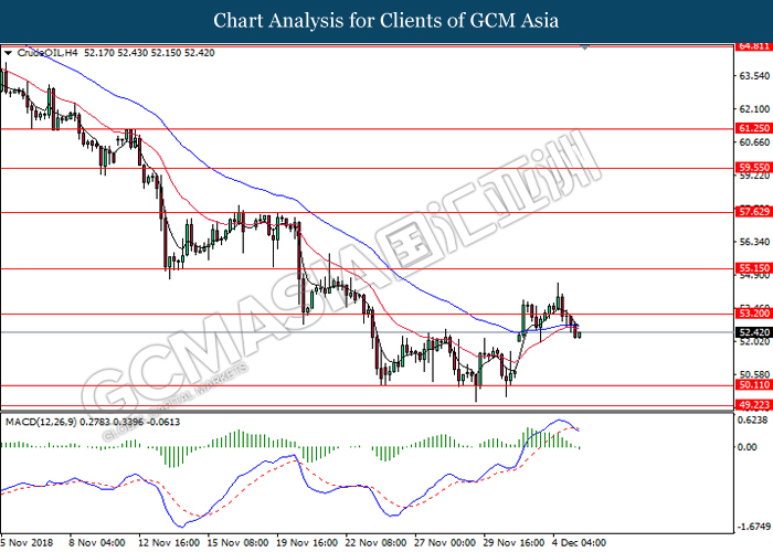 CrudeOIL, H4: Crude oil price was traded lower following prior retracement near the resistance level of 52.00. MACD which illustrate persistent downward signal suggests its price to extend its losses, towards the direction of 50.25.